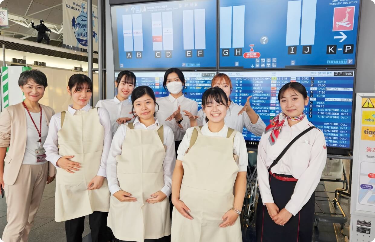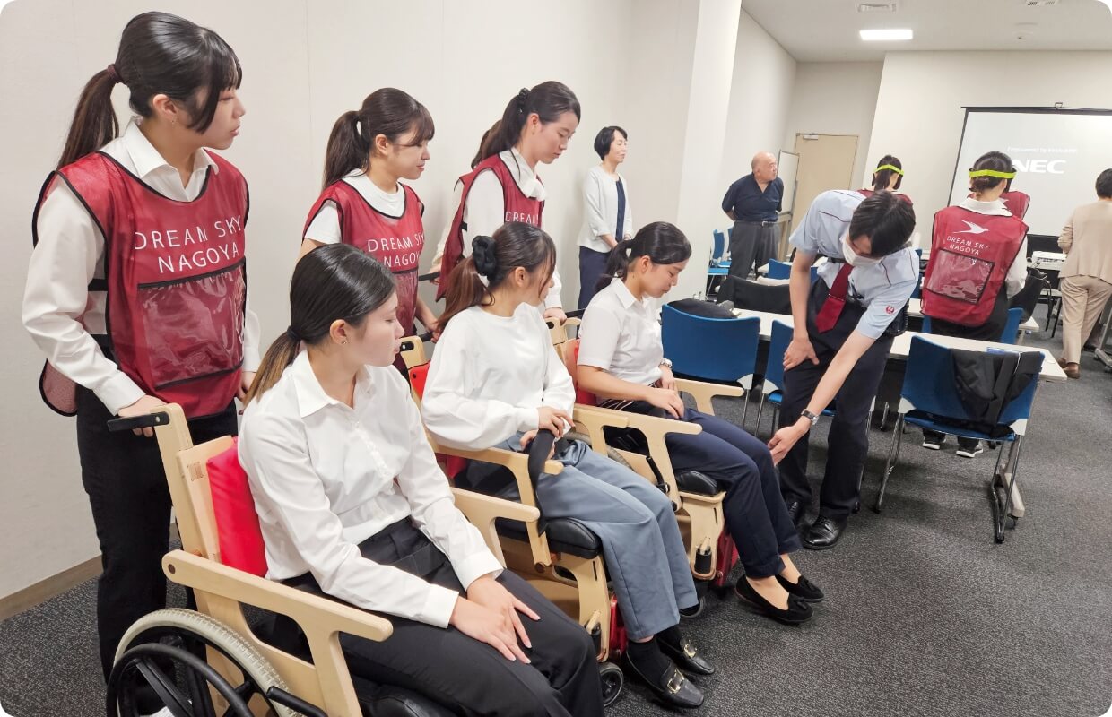 中部国際空港で、JALとドリームスカイ名古屋の現役社員が空港業務をレクチャーし、空港が抱える課題解決にも取り組みます。様々なお手伝いを必要とされる方を想定した空港利用の疑似体験もします。このプログラムを経て、キャビンアテンダントやグランドスタッフなど、航空業界で多くの卒業生が活躍しています。