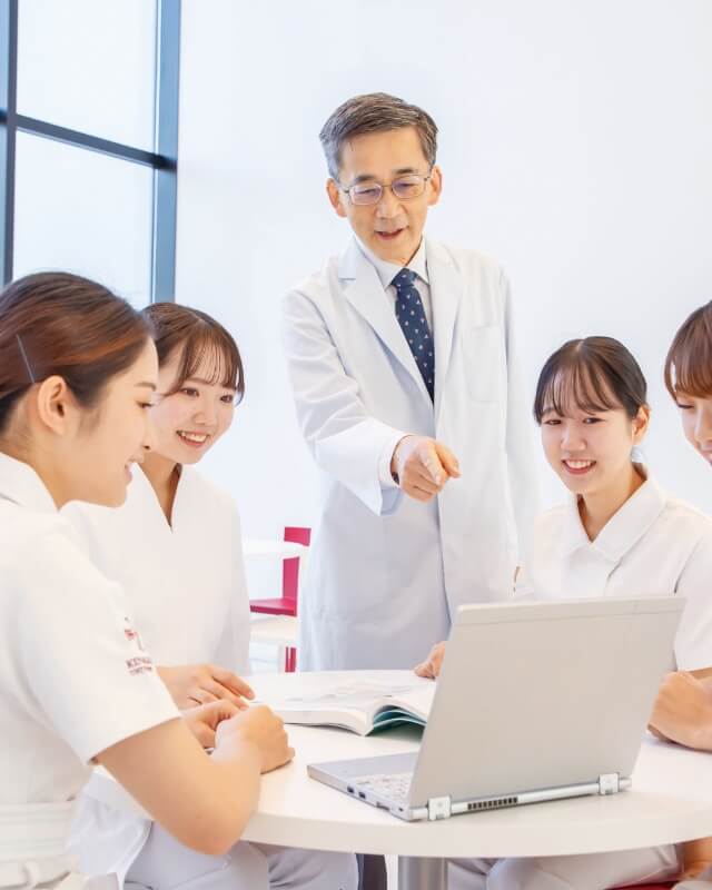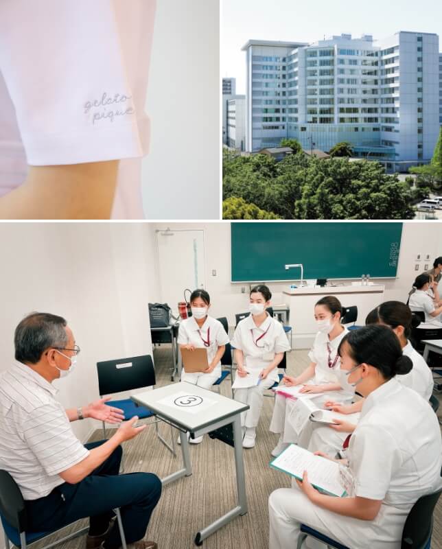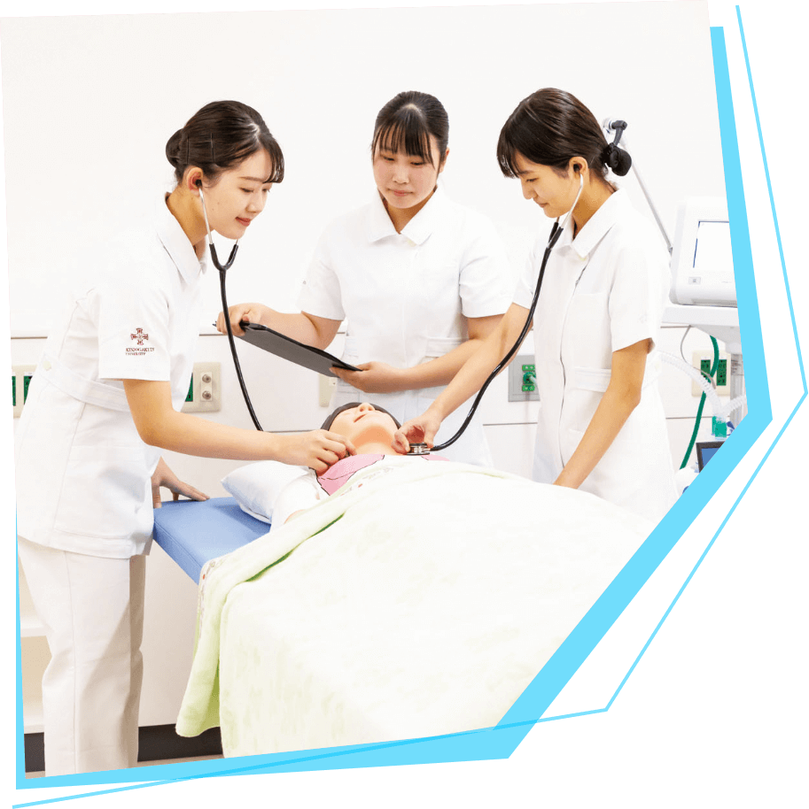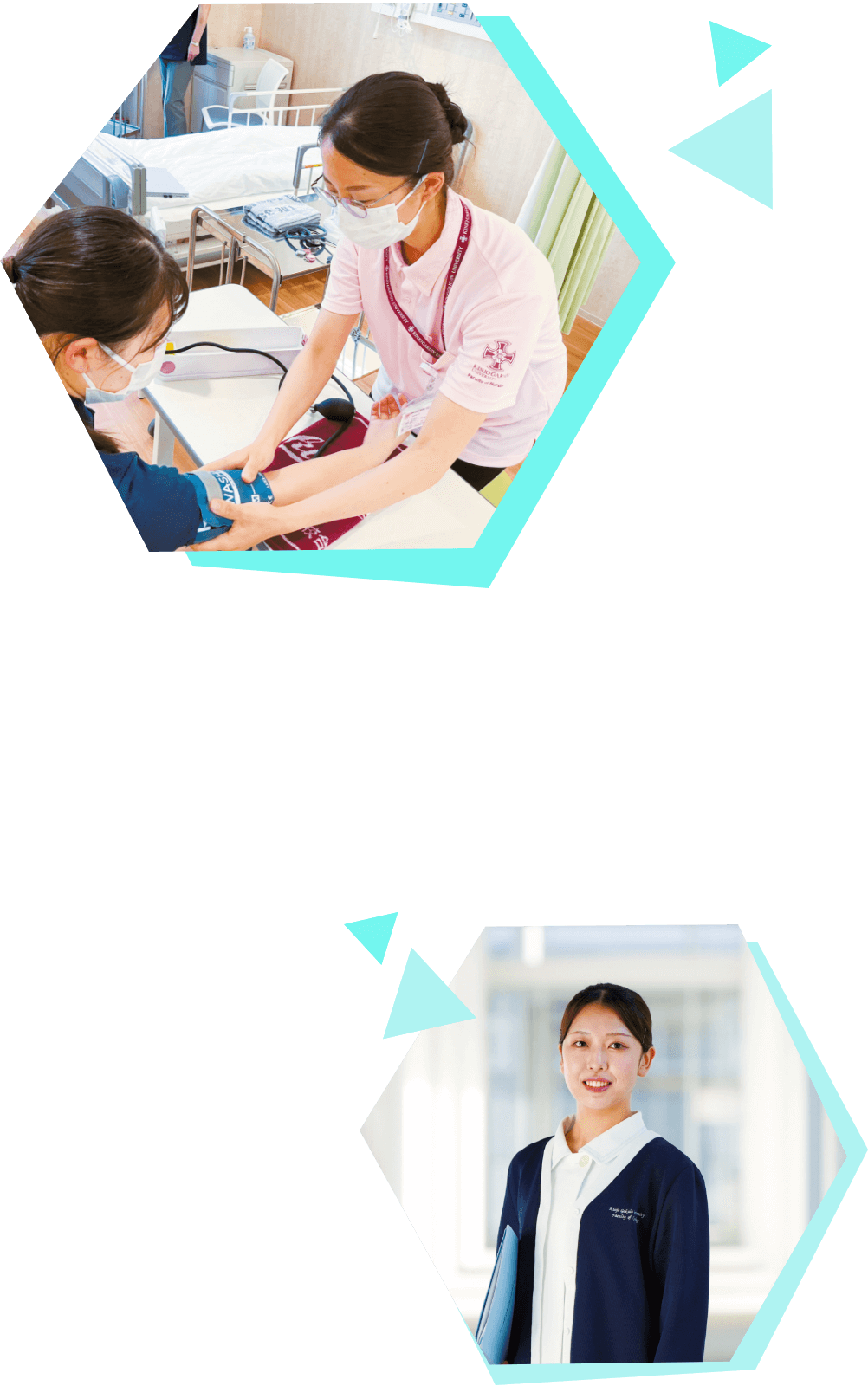 1年次から国家試験を見据えた学修支援を行い、看護師と保健師の国家試験100%合格を目指します。指導する教員も全員プロフェッショナルですのでご安心下さい。また、人気投票で選ばれた「金城学院オリジナル ジェラートピケのナースウェア」を着用します。スタイリッシュでありながら清潔感があり、学生からも好評です。