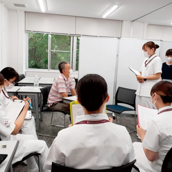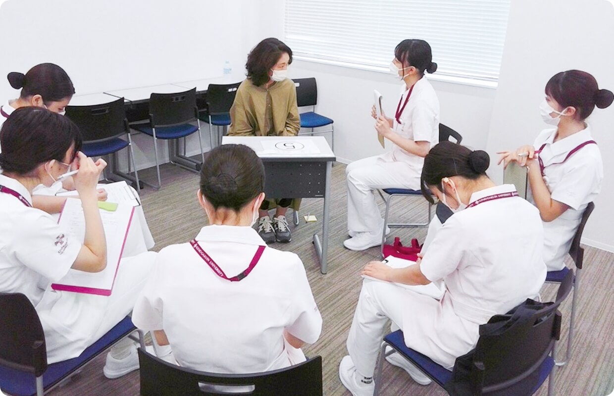 看護職、心理職、管理栄養士、薬剤師といった国家資格の取得を目指す各学科の学生が金城学院大学では同じキャンパスにいます。よって、合同でグループワークに取り組み、例えば「障がいを抱えながら地域で生活すること」などの事例に対して支援のあり方を考えます。互いをリスペクトし高め合える環境でもあります。