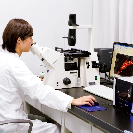 投与薬に応じて容態が変化する人体モデル、化合物の分子量測定装置、放射化学実習室、化学系実習室、薬理系実習室など、申し分ない設備が揃っています。蛍光抗体や蛍光タンパク質で目印した試料の観察などに用いる共焦点レーザー顕微鏡もあります。設備が充実していることは国家試験合格の後押しとなります。