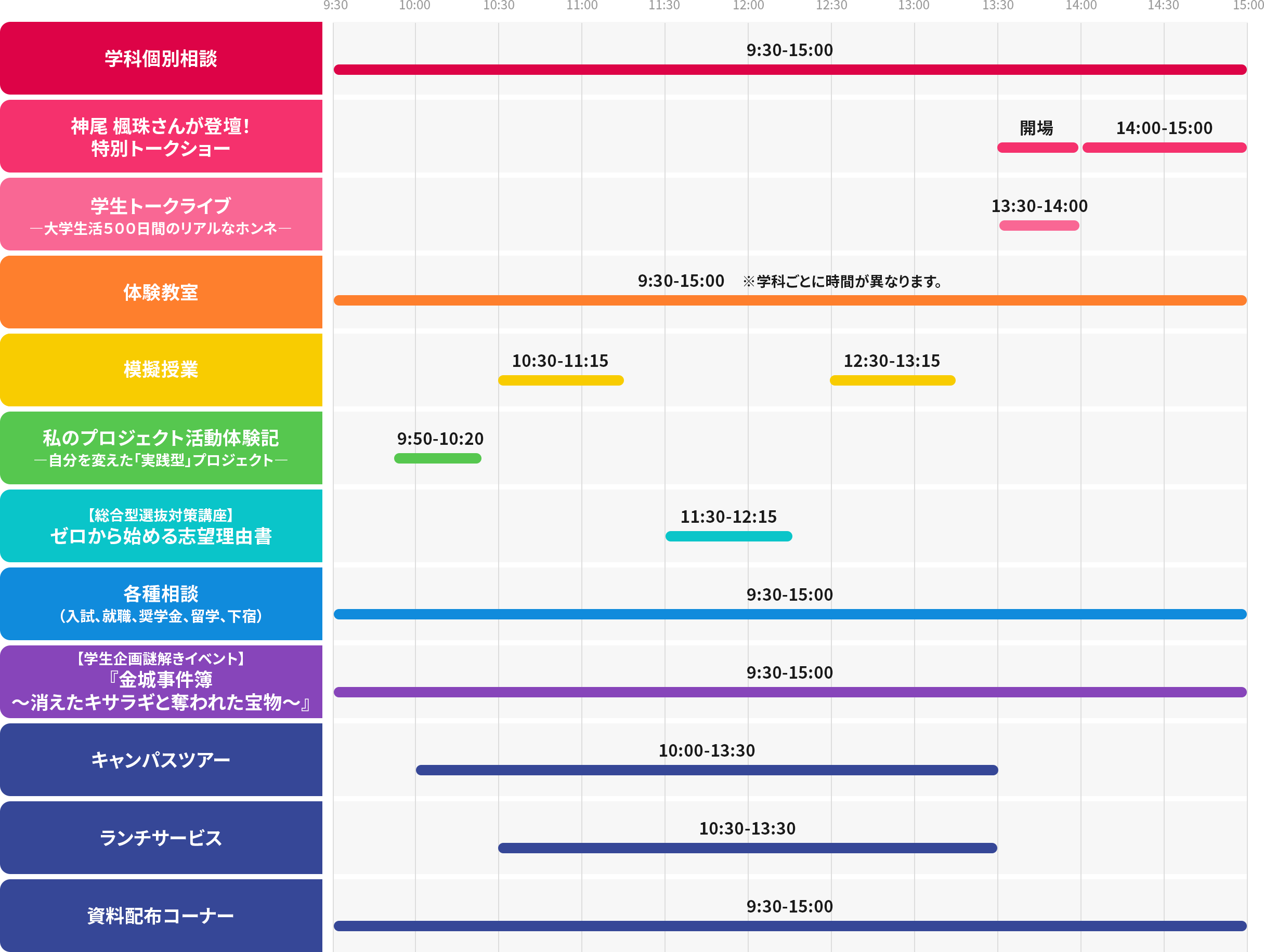 - あります。特に人気なのは各種相談コーナーです。入試制度や奨学金、就職サポートなどについて、専門のスタッフが相談をお受けしています。